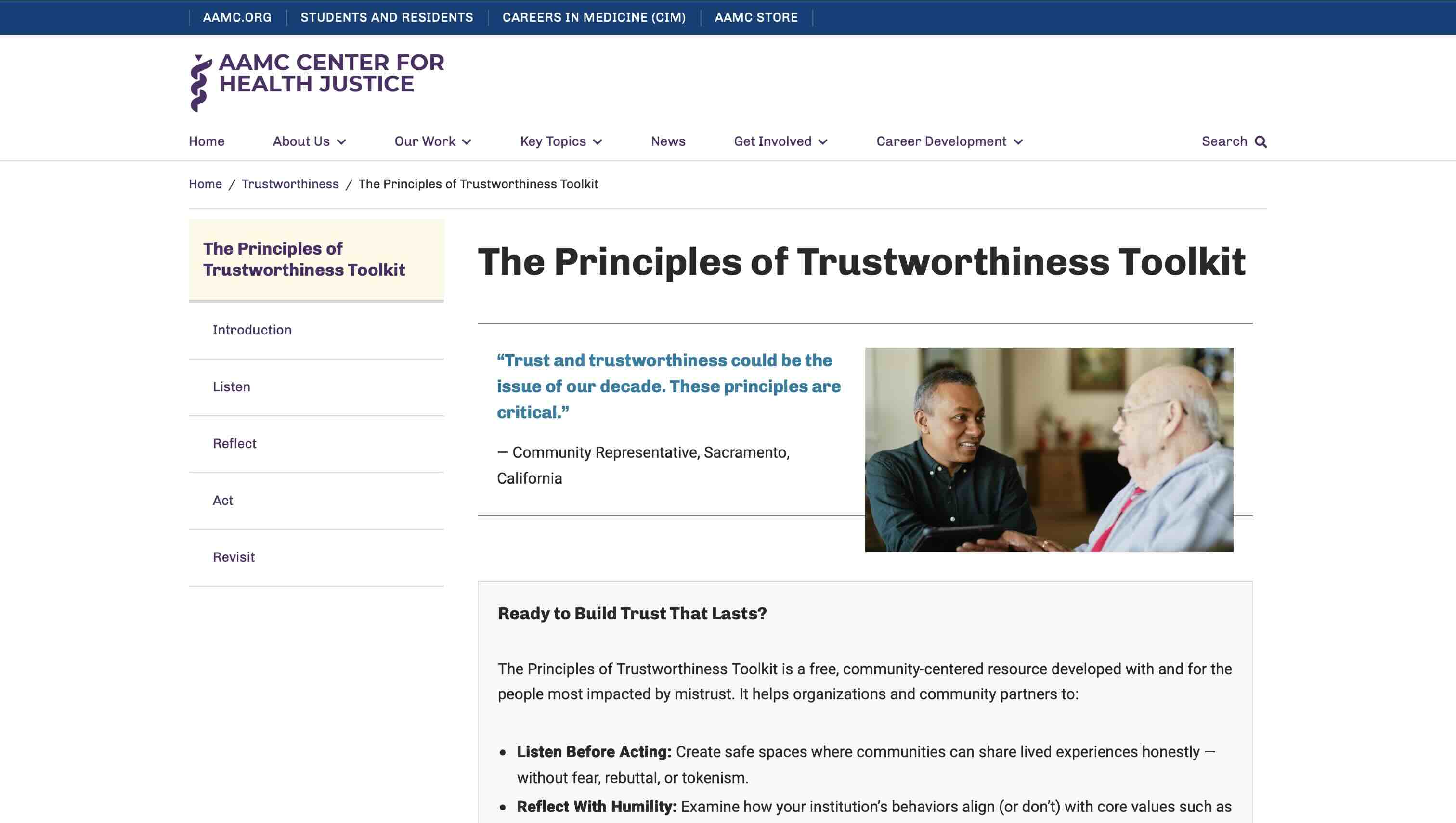 The Trustworthiness Toolkit, created by the Association for American Medical Colleges (AAMC) Health Justice, is a resource designed to help all organizations bu...