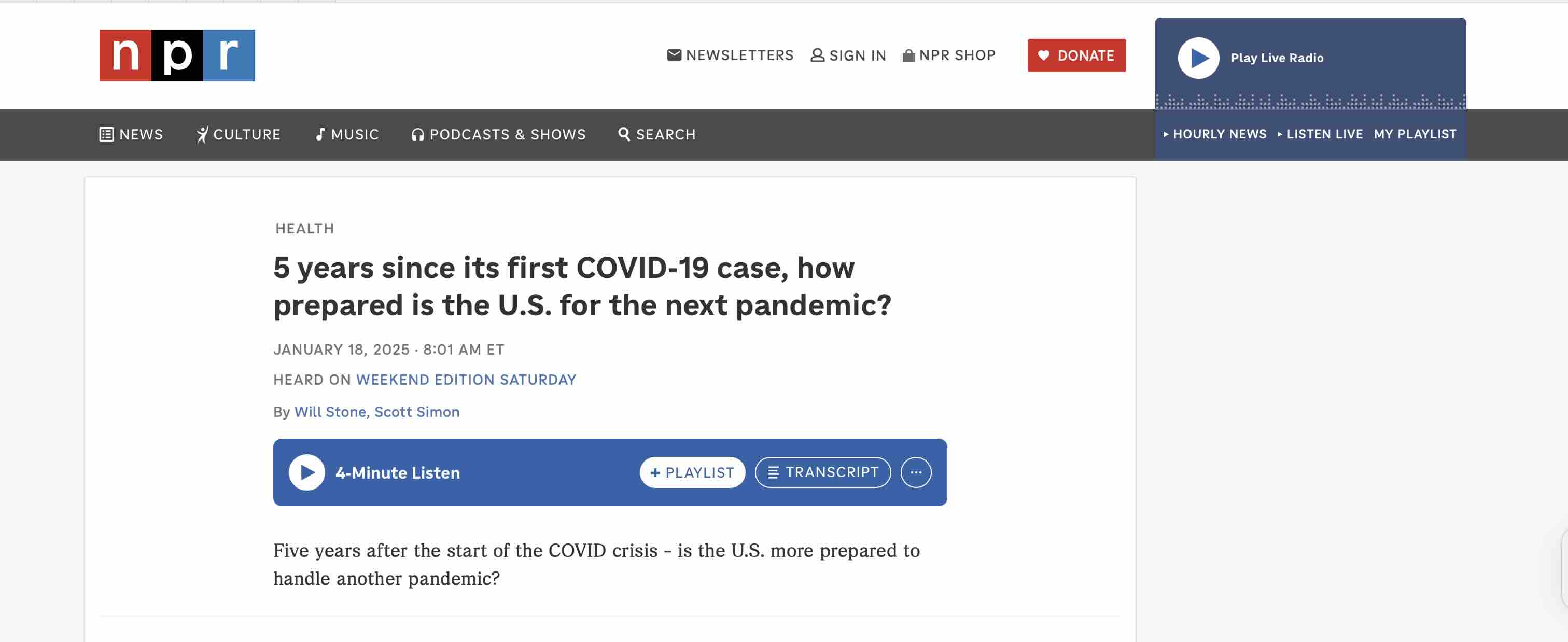 This resource examines the U.S.’s readiness for future pandemics five years after COVID-19, highlighting challenges in public health funding, workforce fatigue, public trust, and emerging threats like bird flu, while noting advances in vaccines and disease surveillance.