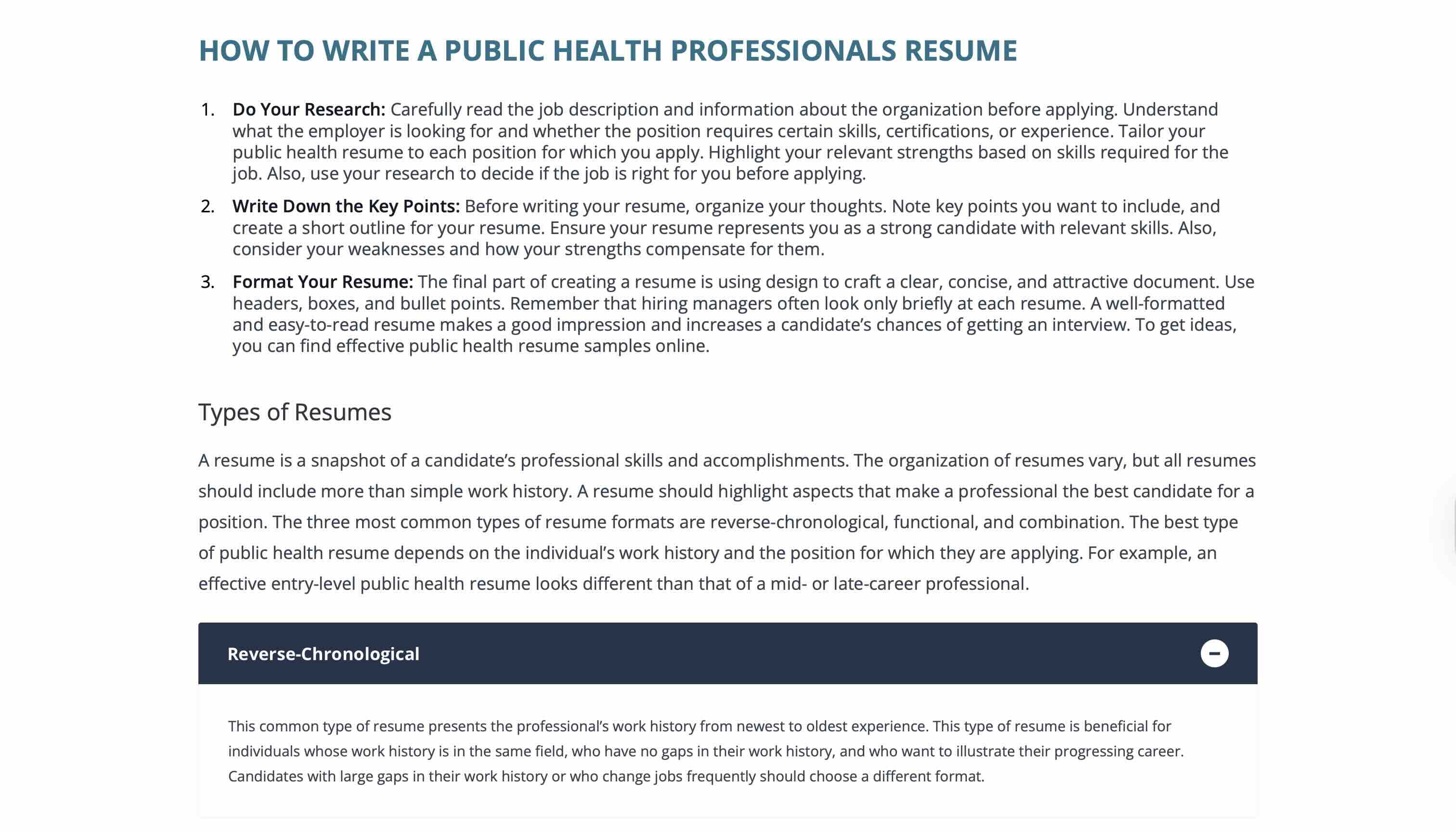 This resource is a detailed guide that walks through writing and structuring a strong public health resume.